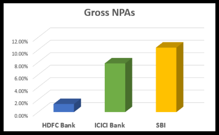 - The Gross NPA based on March 2018 numbers is 1.3%. This is against close to 10% of Gross NPA of SBI reported in Dec 2017. The corresponding number for ICICI is around 8%.