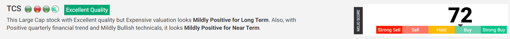 This is where investors would need hand holding and need proper guidance. I am happy to inform you that MarketsMojo in new year started new feature where each stock has score on the dashboard. This is one of the best ways we can guide our investors what one needs to be done with the stock that you intend to buy or stocks that you hold in the portfolio. I am appending score of TCS for your reference.