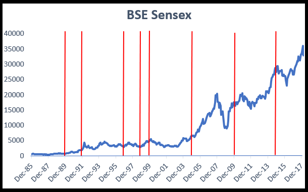 India is a great example of this. We have had a chaotic democracy and a partial free market for decades. In this chaos, the BSE Sensex has gone up 14% compounded over the last 33 years. The red lines indicate Elections.