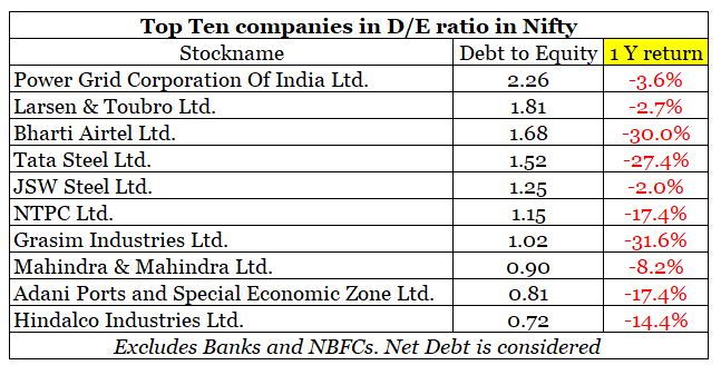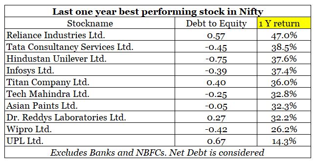 My study on Nifty 50 companies (excluding NBFCs and banks) shows that no company having debt-to-equity ratio of more than one gave positive share price returns in the last one year. The companies whose debt moved up with poor financials performed the worst, like Bharti Airtel whose debt moved up from Rs 1 lac crore as of March 2016 to Rs 1.15 lac crore in September 2018 or Tata Motors, whose debt increased from Rs 70000 crore to Rs 92000 crore during the same period. Both these companies have struggled to report growth in their bottom lines. On the other hand, companies like TCS and Hindustan Unilever did well on the bourses as they have no debt and have good amount of liquidity in the balance sheet. Look at the table below that shows best returns in last one year came from zero debt companies in last one year.