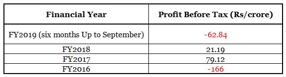 The company’s financials are not of much comfort to the investors. For FY2016, the company’s loss at PBT level (before exceptional items) was Rs 166 crore. The same figure improved in FY2017, where the company reported profit of Rs 79.12 crore. But again, it took a dip in FY2018, when the profit declined to Rs 21.19 crore. In the first six months of the current year, the PBT (before exceptional items) showed a loss of Rs 62.84 crore. In all probability, the company will report losses in the current financial year. The past financial performance does not inspire much confidence.
