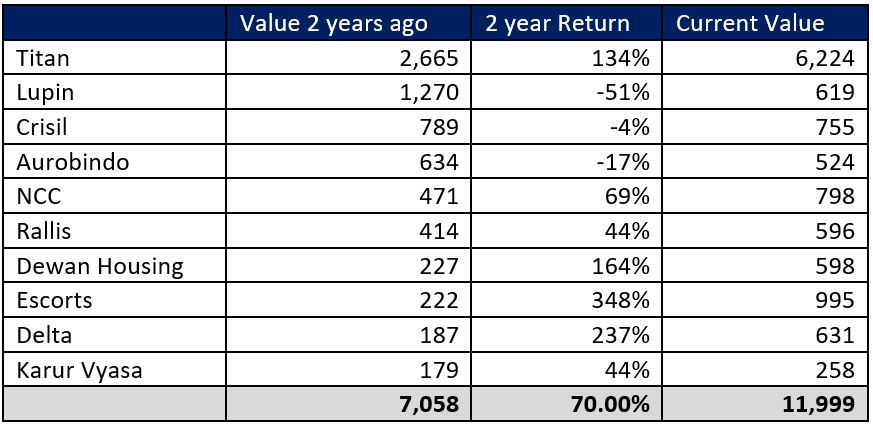 We were researching the success secrets of the most well-known investors and we came across a very interesting article published in November 2015 in the Livemint newspaper. The story was on the long-term performance of Rakesh Jhunjhunwala (RJ), the flag bearer of the Indian Investment Gurus. The article had done a study on RJ’s investments and showed how his portfolio had done. He had some very big winners, some average performers and even some losers. They also published his top 10 holdings, which had been held for at least one year, at that time. See below…