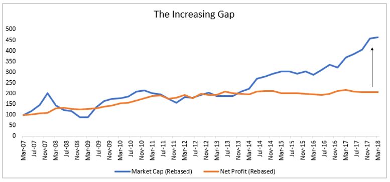 This profit stagnation coupled with the rise in stock prices has led to a rise in the Price/Earnings (P?E) ratio of the market. The Market Cap weighted P/E ratio of all the listed companies put together is around 35x on past earnings. This is definitely not cheap.