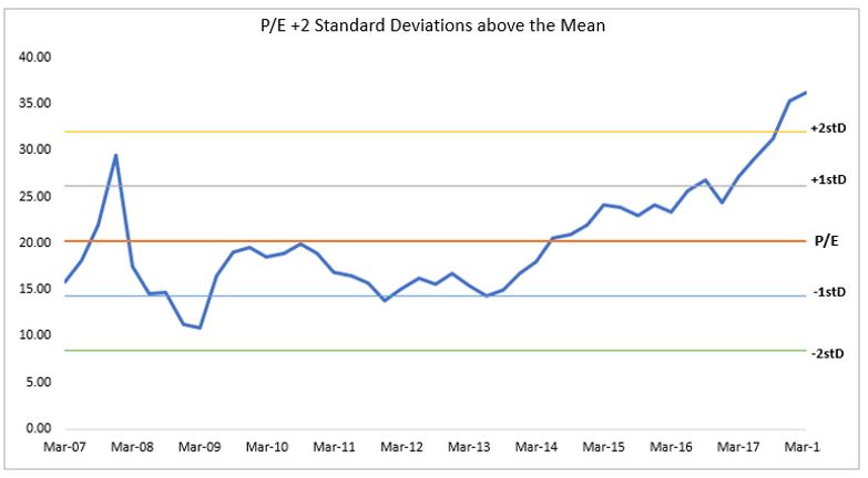 The chart below shows that the P/E ratio, in fact, is more that 2 standard deviations higher than the mean since 2007.