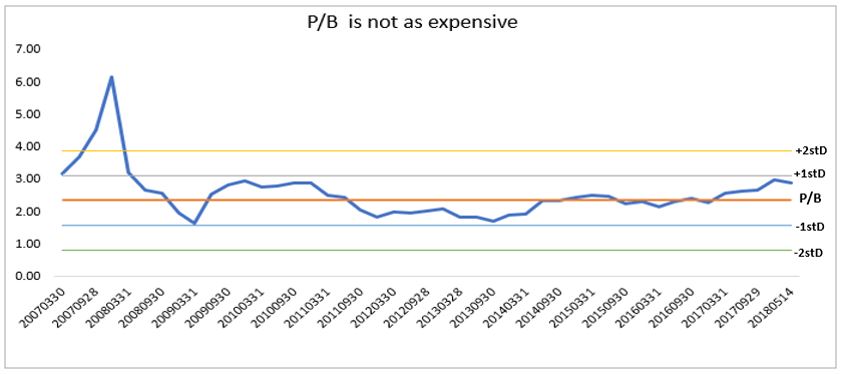 The chart below shows that P/B at 2.9x is higher than the long term mean, but it is within one standard deviation from the mean.