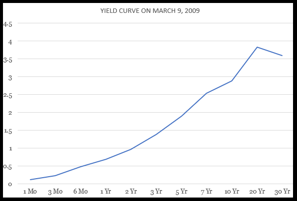 Sure enough, a steep yield curve is generally seen at the beginning of a period of economic growth. The chart below depicts the positively sloped yield-curve on March 9th, 2009, the day when the US (and the Indian) stock markets bottomed out. This was a beginning of a long period of growth for the US Economy.
