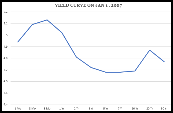 Below is the chart that depicts an inverted yield curve on Jan 10th, 2007. This was the day when the US markets peaked as a precursor to the recession driven by the Global Financial Crisis.