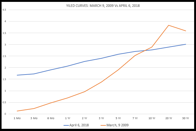 The chart below compares the yield curve on March 9th, 2009 (orange line) which is when the current Bull market began and the yield curve on April 6th, 2018 (Blue Line).