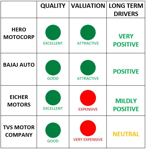Overall, based on these and some more parameters, our prognosis is that Hero MotoCorp and Eicher Motors quality as Excellent Quality stocks which Bajaj Auto and TVS Motor Company qualify as Good Quality stocks.