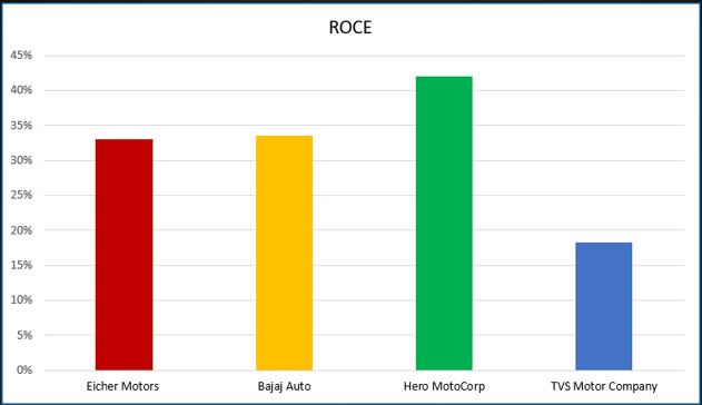 The Return on Capital Employed (ROCE) is a better measure than ROE for companies with debt. However, it still instructive to look at this number. The 5 year average ROCE of the three is higher than ROE again confirming the analysis of ROE. TVS Motor’s ROCE is however a bit lower because of the Debt that it has on its balance sheet but it is still above 15%.