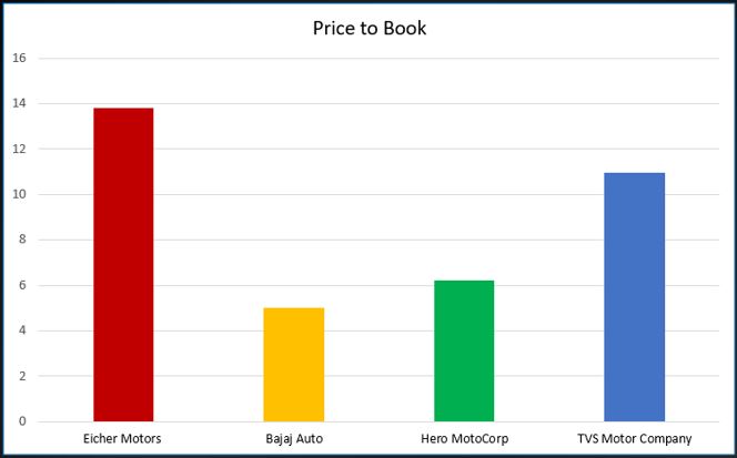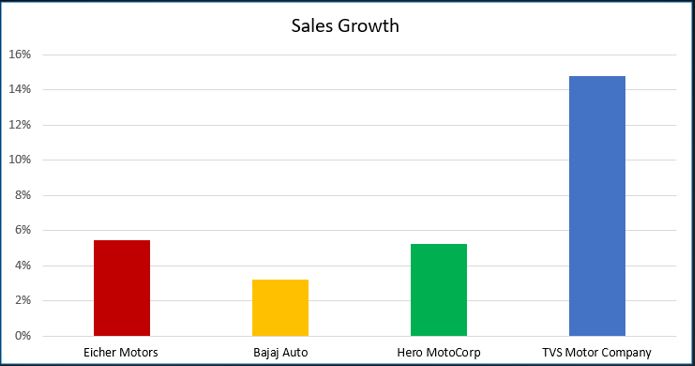 The average 5-year sales growth has been high for TVS Motor. However, the growth for others is not too high. Bajaj Auto has been especially disappointing. This partly reflects the consolidation phase in the Indian economy and the fact that this sector is reasonably mature.