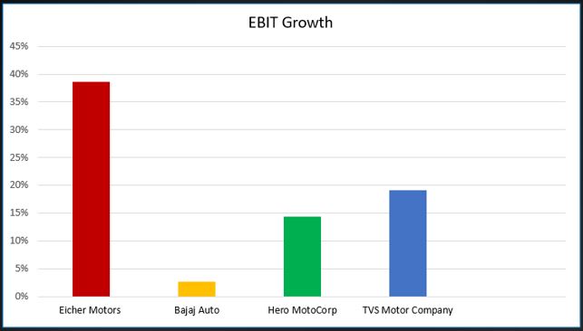 The EBIT growth, other than for Bajaj Auto, has been higher than the Sales growth indicating that the margins have improved for the other three. The growth in Eicher Motors has been much higher partly as it morphed into mainly a two-wheeler company.