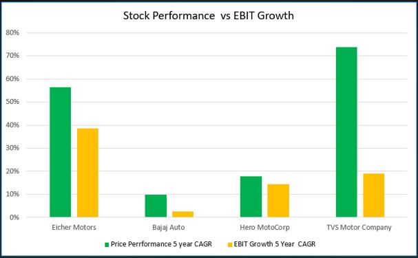 - In the case of TVS Motor, the divergence between price performance and EBIT growth has been extremely high.