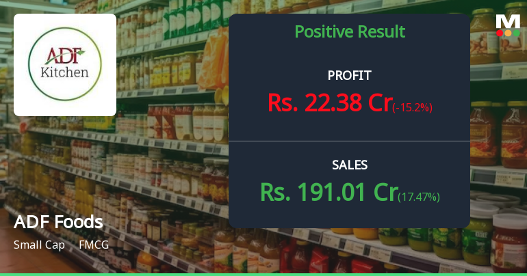 2026-02-04 09:52:18ADF Foods Ltd., a small-cap FMCG player specialising in ethnic Indian food products, reported a mixed performance for Q3 FY26 (October-December 2025), with robust revenue growth offset by declining profitability and margin compression. The company posted consolidated net profit of ₹22.38 crores for the quarter, marking a sharp 15.20% decline sequentially from Q2 FY26's ₹26.39 crores, though still managing a 19.30% year-on-year improvement over Q3 FY25's ₹18.76 crores. Following the results announcement, the stock surged 4.28% to ₹215.65 on February 4, 2026, though it remains significantly below its 52-week high of ₹301.00, trading at a market capitalisation of ₹2,369.21 crores.