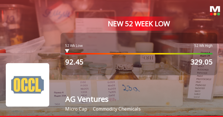 2026-03-16 12:35:55AG Ventures Ltd, a micro-cap player in the Commodity Chemicals sector, touched a fresh 52-week low of Rs.92.45 today, marking a significant milestone in its ongoing decline. The stock has been under pressure for the past six consecutive trading sessions, shedding 13.2% in returns during this period and underperforming its sector by 3.72% on the day.