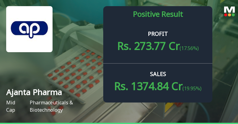 Read full news articleAjanta Pharma Ltd. reported its Q3 FY26 results, showcasing a solid performance in terms of revenue and profit growth. The company achieved net sales of ₹1,374.84 crores, reflecting a year-on-year growth of 19.95%, which is a significant improvement compared to the previous year's growth rate of 3.71%. This indicates a strong ability to capture market share, particularly within its branded generics segment across various regions. The net profit for the quarter stood at ₹273.77 crores, marking a year-on-year increase of 17.56%, up from 10.88% in the same quarter last year. This growth in profitability, while commendable, is accompanied by a nuanced margin narrative. The operating margin (excluding other income) was reported at 27.80%, which, although an improvement from the previous quarter, reflects a slight contraction compared to the same period last year. The company faced challenges with rising employ...