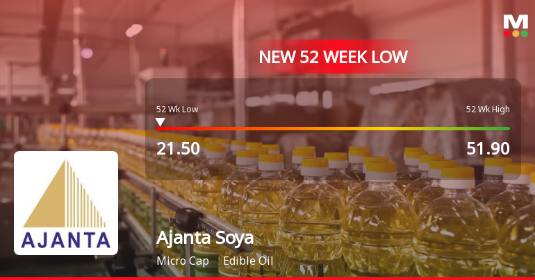 2026-03-04 11:03:08Ajanta Soya Ltd, a player in the edible oil sector, has reached a new 52-week low of Rs.21.52 today, marking a significant decline amid a sustained downtrend. The stock has underperformed its sector and broader market indices, reflecting ongoing challenges in both near-term results and long-term growth metrics.