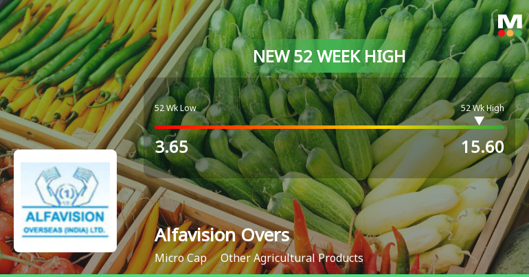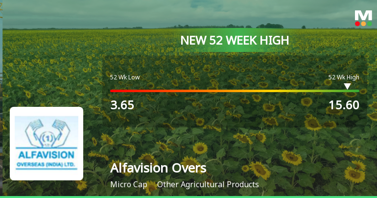 2026-04-09 10:35:06After a sustained rally spanning 21 consecutive trading sessions, Alfavision Overseas (India) Ltd surged to a fresh 52-week high of Rs 14.7 on 09 Apr 2026, marking a remarkable 219.57% gain over this period and significantly outperforming its sector peers.