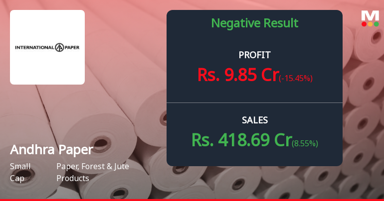 2026-02-04 19:15:37Andhra Paper Ltd., the L N Bangur Group paper manufacturing company, reported a return to profitability in Q3 FY26 with net profit of ₹9.85 crores, recovering from a loss of ₹20.26 crores in the previous quarter. However, the 15.50% year-on-year decline in earnings and deteriorating core operational margins reveal deeper challenges beneath the surface recovery. Trading at ₹67.15 with a market capitalisation of ₹1,299 crores, the stock has declined 22.22% over the past year, significantly underperforming both the Sensex and its sector peers.