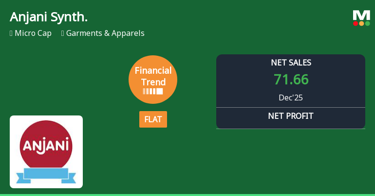2026-02-16 08:00:25Anjani Synthetics Ltd, a player in the Garments & Apparels sector, has reported a flat financial performance for the quarter ended December 2025, marking a notable shift from its previously positive growth trajectory. Despite a robust 24.85% growth in net sales over the last six months, the company’s overall financial trend has softened, reflecting margin pressures and a challenging market environment.