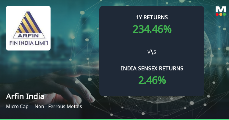 2026-04-10 10:06:38Extending its remarkable rally, Arfin India Ltd surged 3.41% on 10 Apr 2026 to touch a fresh all-time high near Rs 89.04, outpacing the Sensex’s modest 0.85% gain. This milestone caps a stunning 223.57% return over the past year, underscoring the stock’s exceptional momentum within the Non - Ferrous Metals sector.