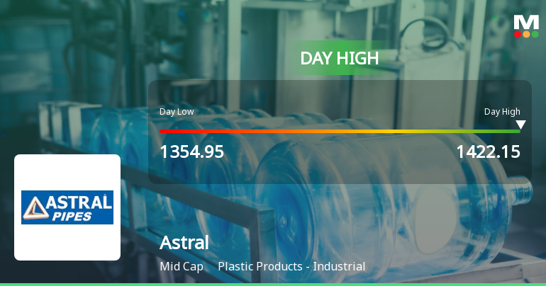 2026-01-22 15:31:28Astral Ltd recorded a robust intraday performance on 22 Jan 2026, surging to an intraday high of Rs 1,413, marking a 4.86% increase and closing the day with a notable 5.01% gain. This surge outpaced the Plastic Products sector and broader market indices, signalling a significant rebound after three consecutive days of decline.