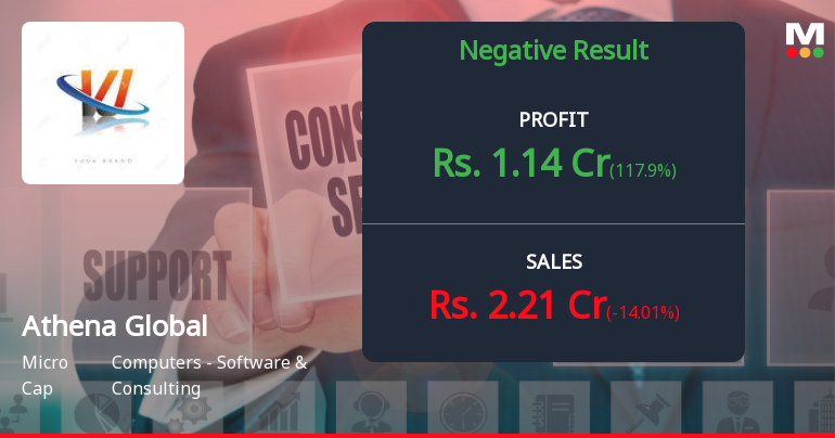 2026-02-16 19:12:03Athena Global Technologies Ltd's latest financial results for Q3 FY26 reveal significant challenges within its operational framework. The company reported a net profit of ₹1.14 crores, which reflects a substantial increase compared to the previous quarter, yet this figure is largely influenced by an exceptional other income of ₹23.52 crores. Without this one-off income, the company would have faced considerable operating losses, continuing a trend of unprofitability in its core operations. Revenue for the quarter was ₹2.21 crores, marking a decline of 47.26% year-on-year and a decrease of 14.01% quarter-on-quarter. This represents the seventh consecutive quarter of declining sales, highlighting persistent difficulties in the company's software development and consulting business model. The operating margin, excluding other income, was reported at -304.07%, indicating a significant deterioration in operatio...