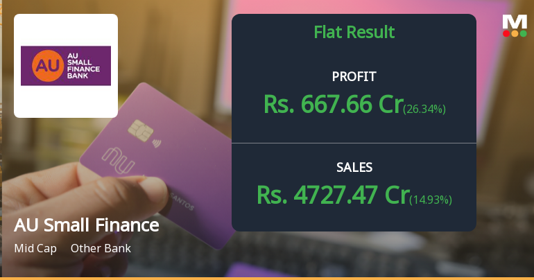 2026-01-20 19:16:37AU Small Finance Bank Ltd. delivered an impressive 26.34% year-on-year surge in net profit for Q3 FY26, posting ₹667.66 crores against ₹528.45 crores in the same quarter last year. The mid-cap lender, with a market capitalisation of ₹75,544 crores, demonstrated robust earnings momentum with a 19.04% sequential jump from Q2 FY26's ₹560.87 crores. However, the stellar profit performance comes alongside persistent margin compression, with Net Interest Margin (NIM) declining to 5.7% from 5.9% a year ago, raising questions about the sustainability of growth quality.