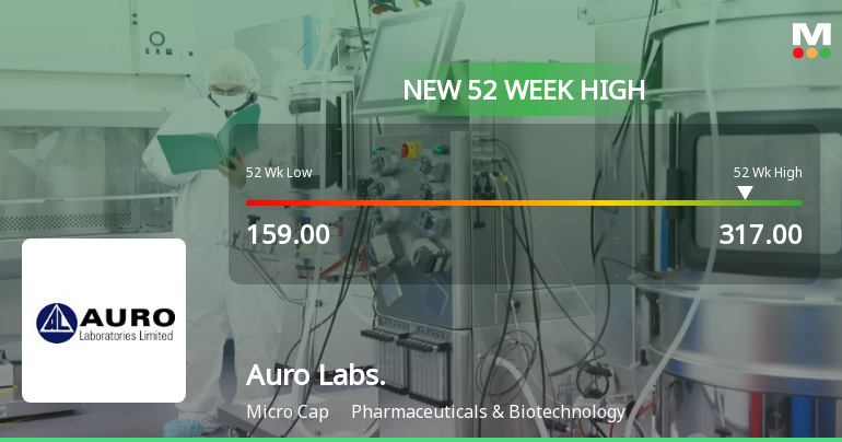 2026-02-18 14:35:18Auro Laboratories Ltd has reached a new 52-week and all-time high of Rs.317, reflecting a robust rally in the Pharmaceuticals & Biotechnology sector. This milestone underscores the stock’s strong momentum, outperforming its sector peers and the broader market over the past year.