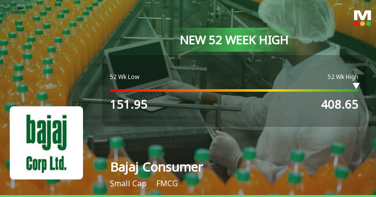 2026-02-25 10:28:24Bajaj Consumer Care Ltd has reached a significant milestone by hitting a new 52-week high of Rs.408.65 today, marking a continuation of its strong upward momentum in the FMCG sector. This achievement reflects the company’s robust financial performance and sustained market confidence over the past year.