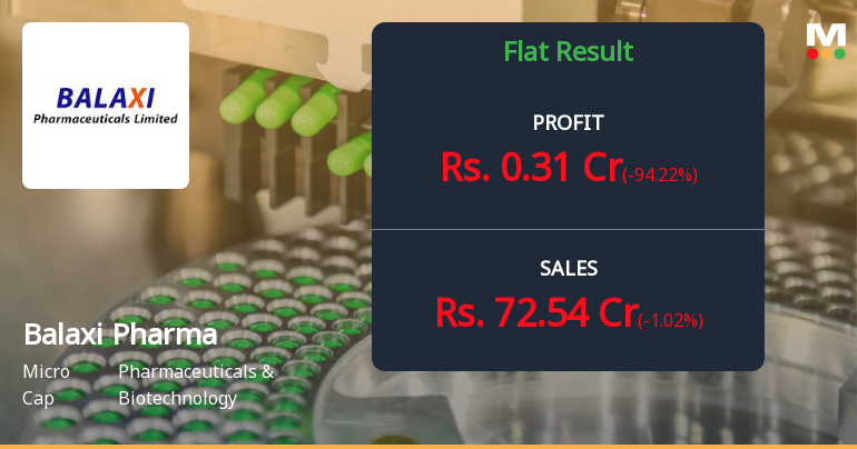 2026-01-28 18:17:24Balaxi Pharmaceuticals Ltd. reported a devastating 94.22% year-on-year decline in net profit for Q3 FY26, with earnings collapsing to just ₹0.31 crores from ₹5.36 crores in the same quarter last year. The micro-cap pharmaceutical company, with a market capitalisation of ₹137.00 crores, saw its profit margins evaporate to a mere 0.43%, down from 7.31% in Q3 FY25, as an extraordinary tax burden and operational inefficiencies ravaged the bottom line. The stock, trading at ₹25.14, has plunged 62.72% over the past year, underperforming the pharmaceutical sector by a staggering 86.83 percentage points.