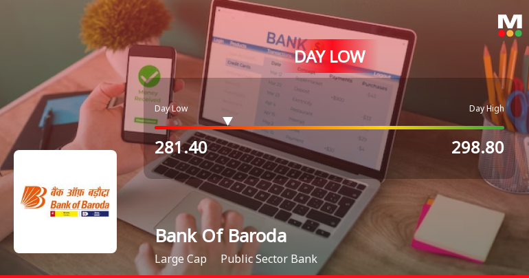 2026-02-01 12:01:24Bank Of Baroda’s shares declined sharply on 1 Feb 2026, touching an intraday low of Rs 288.85, reflecting sustained price pressure amid broader market weakness and sector underperformance. The stock fell by 4.98% on the day, underperforming the Sensex and its own sector, as investors reacted to immediate selling pressures and cautious market sentiment.