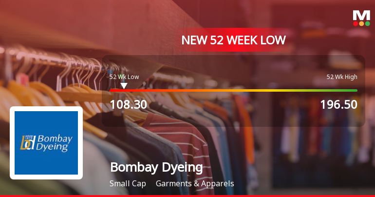 2026-03-02 12:05:03Bombay Dyeing & Manufacturing Company Ltd has touched a new 52-week low of Rs.108.3 today, marking a significant decline in its stock price amid ongoing financial pressures and subdued market performance within the garments and apparels sector.