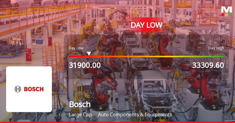2026-03-09 09:30:58Bosch Ltd. witnessed a notable decline today, touching an intraday low of Rs 32,250, reflecting a 3.3% drop as the stock faced significant price pressure amid broader market weakness and sectoral downturns.