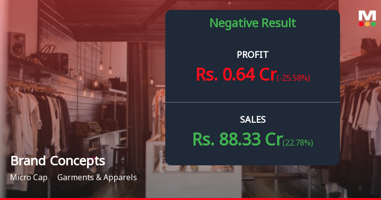 2026-02-13 15:02:16Brand Concepts Limited, a Mumbai-based garments and apparels manufacturer, posted a return to profitability in Q2 FY26 with net profit of ₹2.34 crores, marking a dramatic recovery from the ₹2.72 crores loss recorded in Q1 FY26. However, the quarter's 26.39% year-on-year revenue growth to ₹97.62 crores was severely undermined by a sharp contraction in operating margins, raising concerns about the sustainability of the company's profitability amidst mounting cost pressures and elevated debt levels.