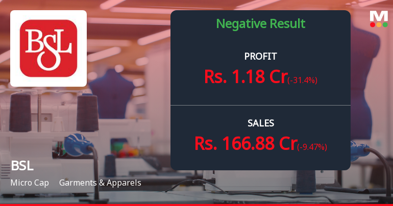 2026-02-09 18:02:29BSL Ltd., one of India's largest vertically integrated textile manufacturers, reported a modest sequential improvement in Q2 FY26 net profit at ₹1.72 crores, representing a 265.96% quarter-on-quarter surge from ₹0.47 crores in Q1 FY26. However, the year-on-year comparison reveals a concerning 31.75% decline from ₹2.52 crores in Q2 FY25, underscoring persistent profitability challenges. With a micro-cap market capitalisation of ₹145.00 crores, the Bhilwara-based company continues to grapple with margin pressures despite achieving sequential revenue growth of 16.66%.