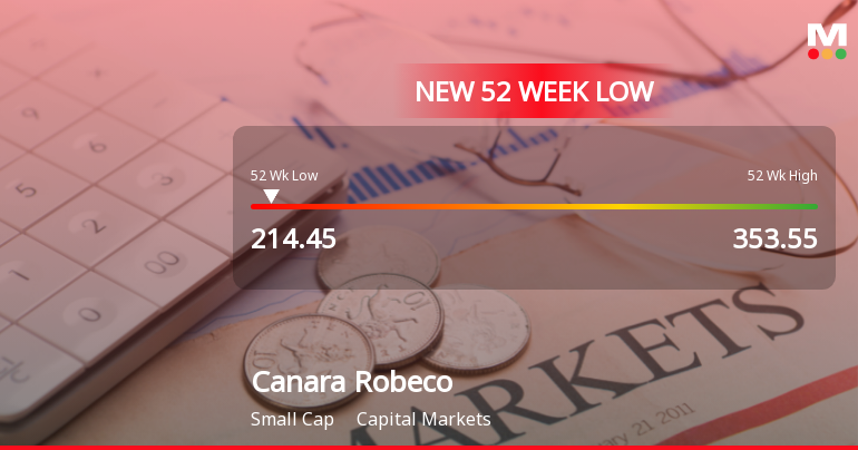 2026-03-09 14:16:40Shares of Canara Robeco Asset Management Company Ltd have declined to a fresh 52-week low of Rs.214.45, marking a significant price level for the capital markets firm amid broader market pressures and sectoral underperformance.