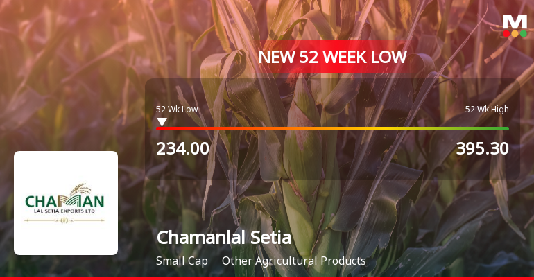 2026-01-21 12:18:51Chamanlal Setia Exports Ltd has touched a fresh 52-week low of Rs.234 today, marking a significant decline in its stock price amid a sustained downward trend over the past several sessions. The stock’s performance continues to lag behind its sector and broader market indices, reflecting ongoing pressures within the company’s financial metrics and market sentiment.