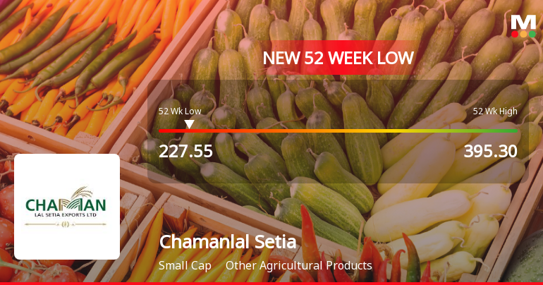 2026-01-23 09:51:32Chamanlal Setia Exports Ltd touched a fresh 52-week low of Rs.227.55 today, marking a significant decline amid persistent underperformance relative to the broader market and its sector peers. The stock opened sharply lower, continuing a downward trend that has seen it lag behind key indices and industry benchmarks over the past year.