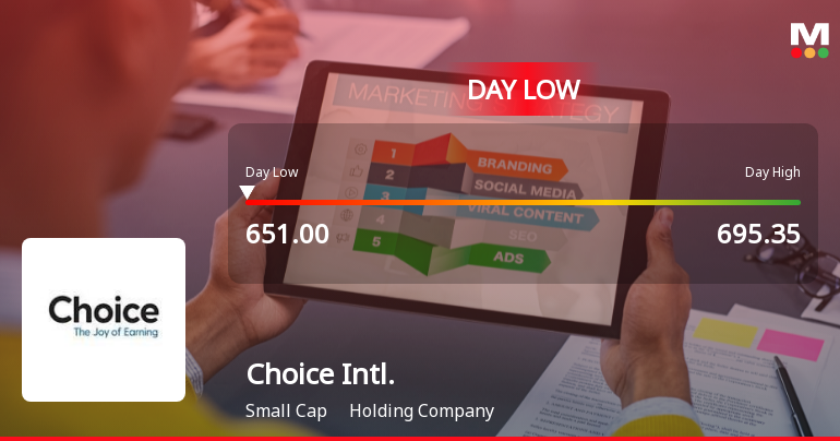 2026-03-09 10:45:52Choice International Ltd experienced a notable intraday decline on 09 Mar 2026, with its stock price touching a low of Rs 654, reflecting a sharp fall of 7.13% during the trading session. This downturn occurred amid broader market weakness and sectoral pressures, contributing to the stock's underperformance relative to its peers and benchmark indices.