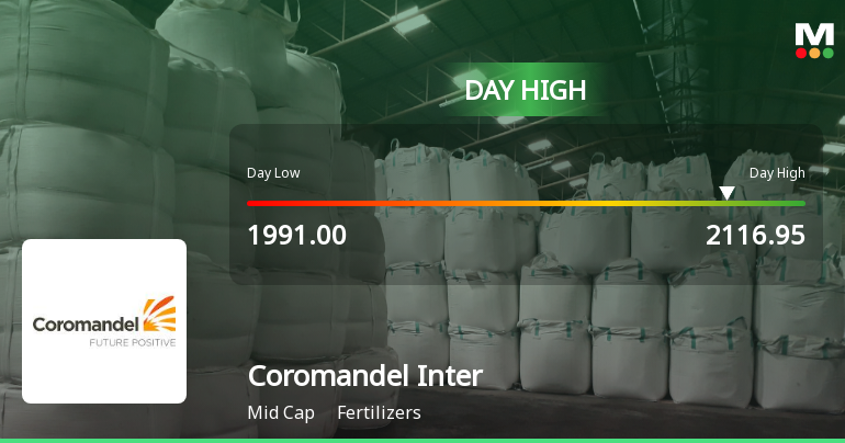 "description": "Coromandel International Ltd recorded a robust intraday performance today, surging to a day’s high of Rs 2,105, marking a 5.3% increase. This rally ended a six-day losing streak, although the stock still underperformed its sector by 2.63% amid a broadly mixed market environment."