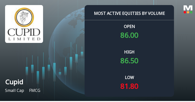 2026-03-11 10:00:14Cupid Ltd (CUPID), a small-cap player in the FMCG sector, witnessed one of the highest trading volumes on 11 Mar 2026, with over 81 lakh shares changing hands. Despite this surge in activity, the stock underperformed, closing sharply lower at ₹87.55, down 5.33% from the previous close of ₹92.85, signalling a notable shift in investor sentiment amid broader sector weakness.