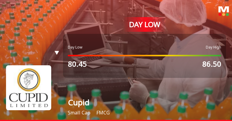 2026-03-12 15:15:53Cupid Ltd’s shares touched an intraday low of Rs 80.55, marking a 7.41% decline as the stock underperformed the FMCG sector and broader market indices amid persistent selling pressure on 12 Mar 2026.