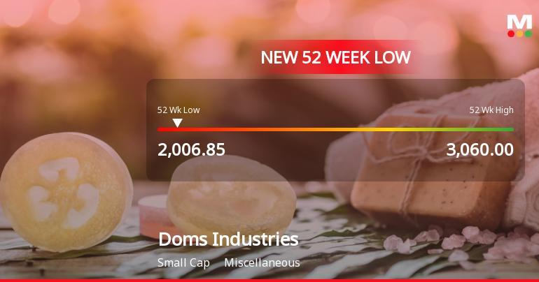 2026-03-09 16:05:00Doms Industries Ltd has reached a new 52-week low, with its stock price touching an intraday low of Rs 2,023.25, marking a significant decline amid a sustained downward trend over the past week. This movement places the stock just 2.75% above its 52-week low of Rs 2,006.85, reflecting ongoing pressures within the miscellaneous sector and broader market conditions.