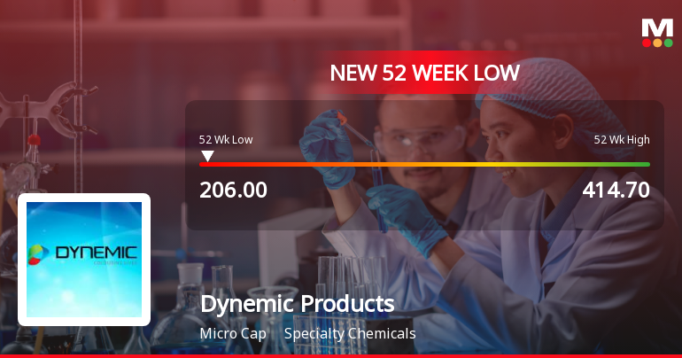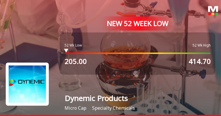 "description": "Dynemic Products Ltd, a micro-cap player in the Specialty Chemicals sector, touched a new 52-week low of Rs.205 today, marking a significant decline amid a sustained downward trend. The stock has underperformed both its sector and benchmark indices, reflecting ongoing concerns about its financial health and market positioning."