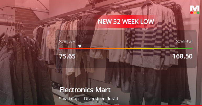 2026-03-09 13:59:55Electronics Mart India Ltd has reached a new 52-week low today, with its stock price touching Rs.75.65. This marks a significant decline amid a broader market downturn and ongoing concerns about the company’s financial performance and valuation metrics.