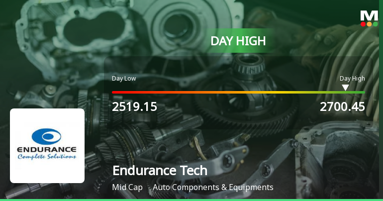 "description": "Endurance Technologies Ltd. demonstrated robust intraday strength on 24 Feb 2026, surging 5.06% to touch a day’s high of Rs 2,700.45. This performance notably outpaced the Auto Components & Equipments sector and the broader market, underscoring the stock’s resilience amid a declining Sensex."