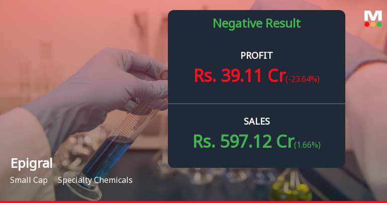 2026-01-30 17:48:51Epigral Ltd., a small-cap specialty chemicals manufacturer with a market capitalisation of ₹4,463 crores, reported a consolidated net profit of ₹39.11 crores for Q3 FY26, marking a sharp decline of 62.26% year-on-year and 23.64% quarter-on-quarter. The results underscore mounting operational challenges as the company grapples with severe margin compression and weakening profitability despite marginal revenue growth.
