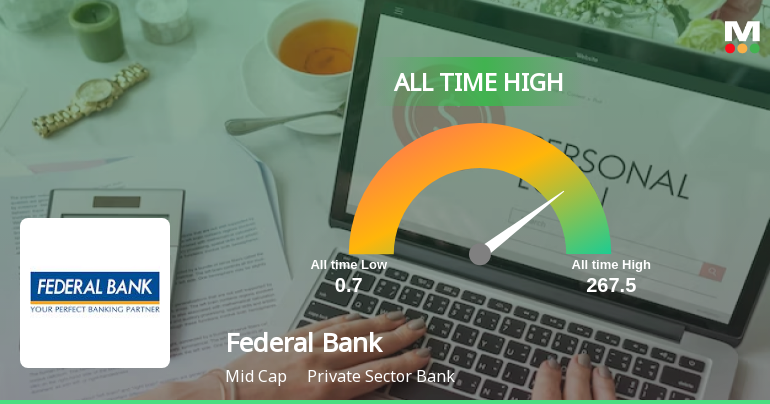 2025-12-19 09:41:01Federal Bank has reached a new all-time high of Rs.267.5, reflecting a notable achievement in its market performance. This milestone underscores the bank's sustained momentum and resilience within the private sector banking industry.