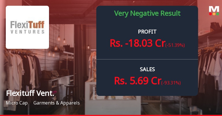 2025-12-10 17:45:27Flexituff Ventures International Ltd., a micro-cap garments and apparels manufacturer, reported a devastating second quarter for fiscal year 2026, with consolidated net profit plunging to a loss of ₹18.33 crores compared to a profit of ₹276.78 crores in the year-ago quarter. The company's revenue collapsed 86.10% year-on-year to just ₹11.11 crores, marking one of the most severe quarterly contractions in the sector. The stock has responded with brutal selling pressure, plummeting 74.42% over the past year to trade at ₹15.35, with the company's market capitalisation now standing at a mere ₹53.00 crores.